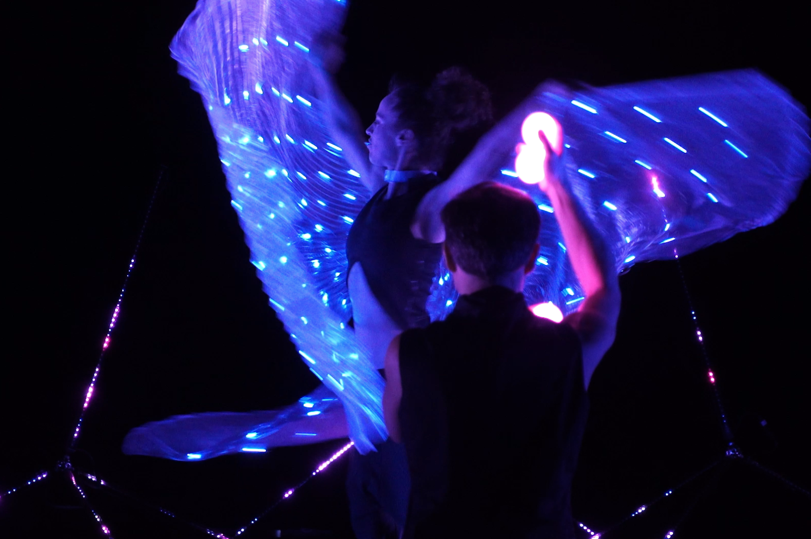 Les artistes œuvrent dans un univers 3D composés de LEDs interactives. Les corps, la musique et les couleurs s’entrechoquent en un univers visuel composé de verticalités.